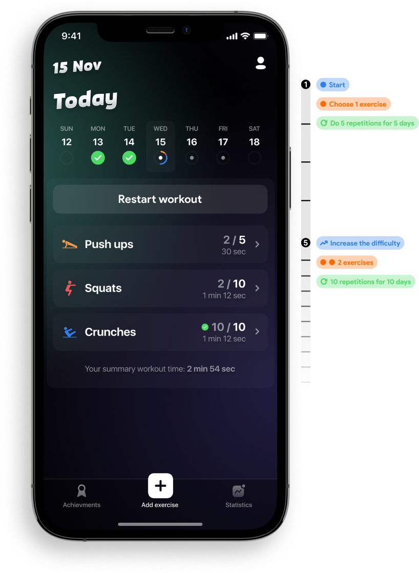 Основная миссия приложения помочь сформировать привычку и подготовить пользователя к фитнесс приложениям с более сложными программами тренировок.